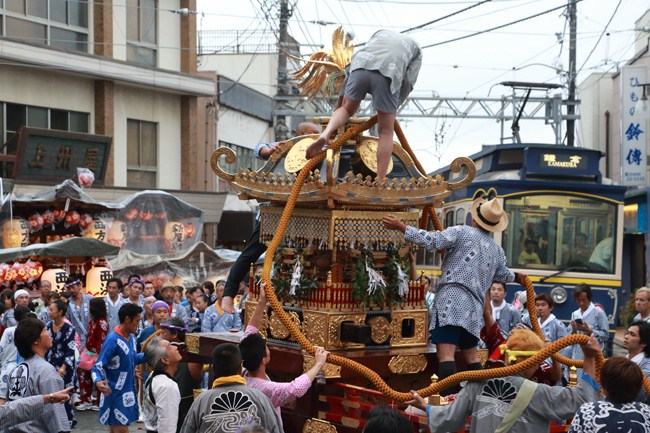 屋台や山車が龍口寺前に勢ぞろい。神輿も登場。組立の最中、傍らを江ノ電が横切る名シーン!