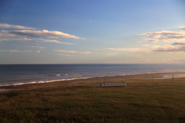 半逆光の青空と海。単行キハ40お似合いの風景です。