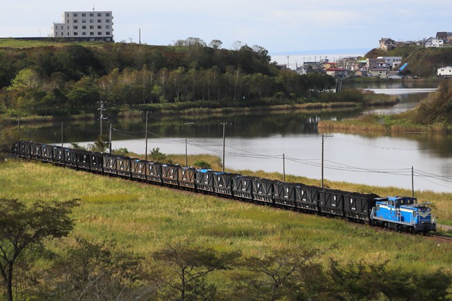 平日なので動いているのを期待して釧路臨港。待つこと十数分で踏切音! 石炭満載で港方面に行きました。