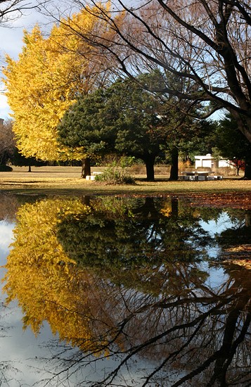 芝生広場には、池のような巨大な水溜りが出来ていました。風は無く、見事な水鏡が‥