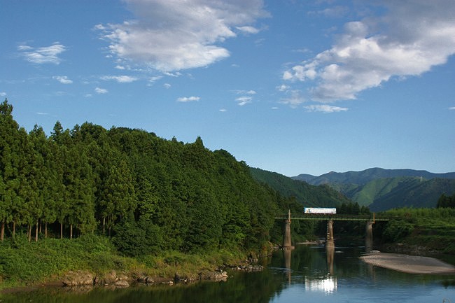 同じ場所から。国鉄時代の鉄橋を渡るレールバス