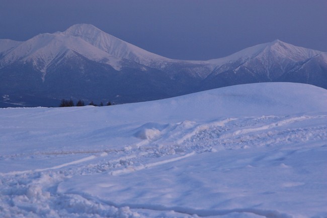 美馬牛小学校の裏手の道路から、ようやく雪山をゲット。もう日が傾いてきた。夕陽タイムは、残照に染まる十勝連峰も捨てがたいと思ったが、定番クリスマスツリーに向う <EOS 20D Canon EF70-200mm f4L USM>