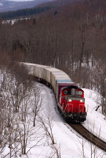峠道の除雪は途中まで。よって定番146kpには間に合わず、144kpあたりの斜面での撮影になった。スケール感は今ひとつのポイントであったが、望遠で機関車を大きく捉えたので、峠を力走する雰囲気を収めることができました