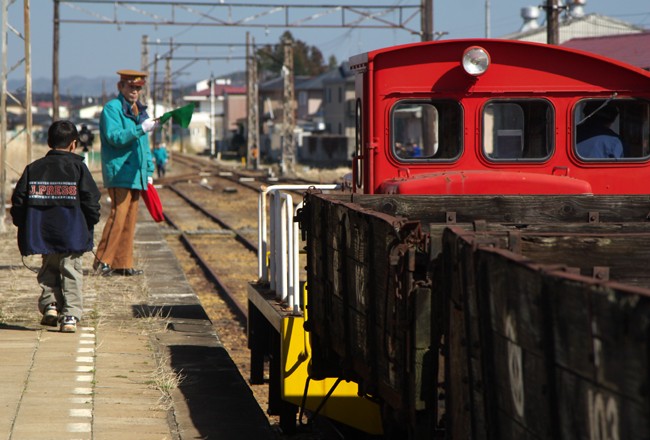 若柳駅では、貨物列車が入庫するシーンに間に合いました。途中では、ボンネットバス、オート三輪と並んでの撮影会もあったそうです。
