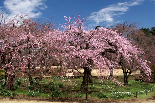 一足先に、枝垂れ桜が開花。強風に揺れていました。染井吉野も「もうすぐ」