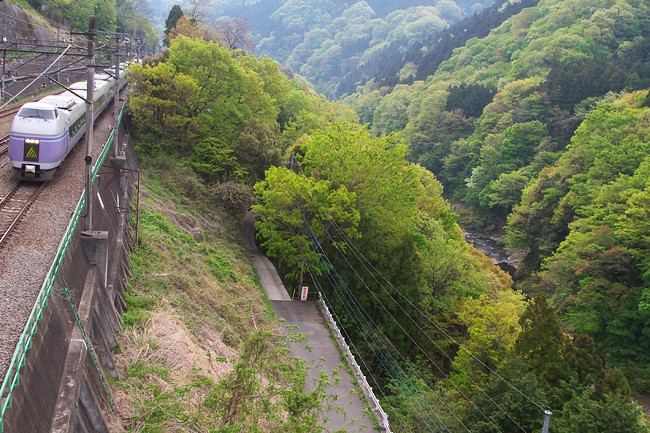 新緑の渓谷沿いの鉄路。ちょっと無理のある構図ですが‥