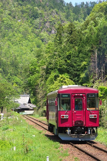 美濃市駅から2駅で、湯の洞温泉口駅に到着。お目当ての藤はまだ早かった。でも、緑の中に吸い込まれていくナガラ3号。新緑が心地よい駅です。