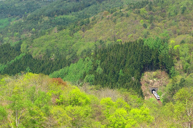 萌える高原( 山田線 区界) 敢えて「列車」は必要なのかと一瞬思うほどの、いまだかつて見たことのない鮮やかな新緑。でもやっぱり待ちました。 <EOS 20D Canon EF70-200mm f4L USM>
