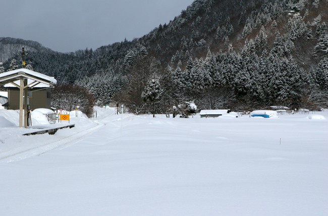 小さなプラットホーム。私好みの小駅。雪が止み、日が差す。条件が良いときに列車はこない。