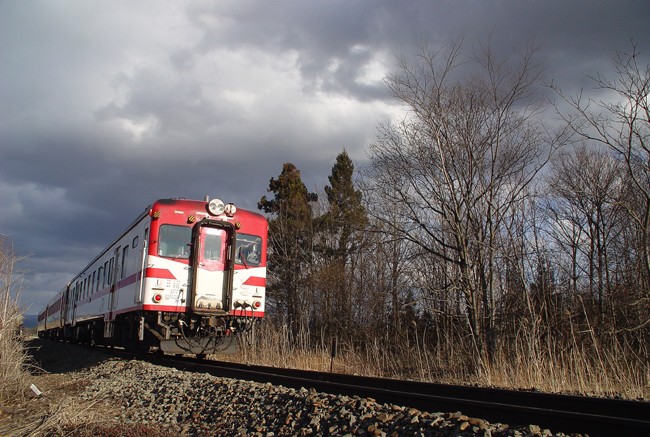 雨か列車か、どっちが先か。気をもみながら待った。(列車通過直後、春の嵐に)