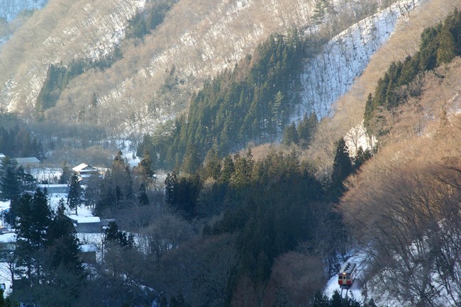 やわらかな冬の朝日が山肌を降りてくる頃、単行キハが登ってきた。染み入る風景に、寒さも忘れる