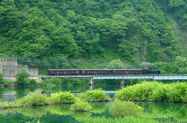 まだ、若葉色が残る初夏の只見川に沿って、上りのC11。水鏡より敢えて緑多き構図を選びました。