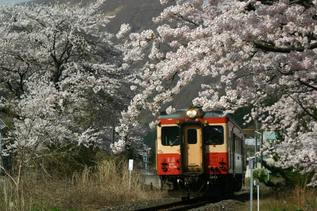 朝の陽射し、春風にそよぐ満開の桜、国鉄色単行‥、条件が揃ってゴキゲンの撮影開始