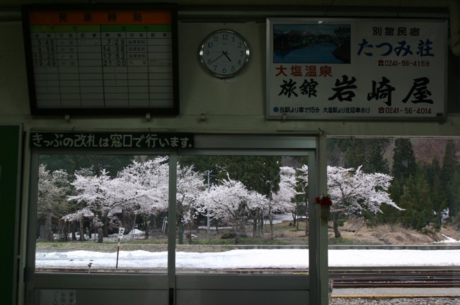 夕刻、只見に到着。ここから先は残雪のため国道はまだ閉鎖中。駅前の染井吉野はまさに満開。線路の脇には雪が残っている