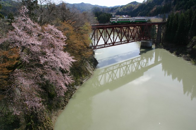 423D。横田・大塩間の山郷風景(写真後方)を撮る予定だったが、桜があまりに見事だった七橋を選択