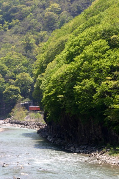 427D 本日の大糸線は「オール国鉄色」。このタラコには新緑がお似合い (中土・北小谷間)