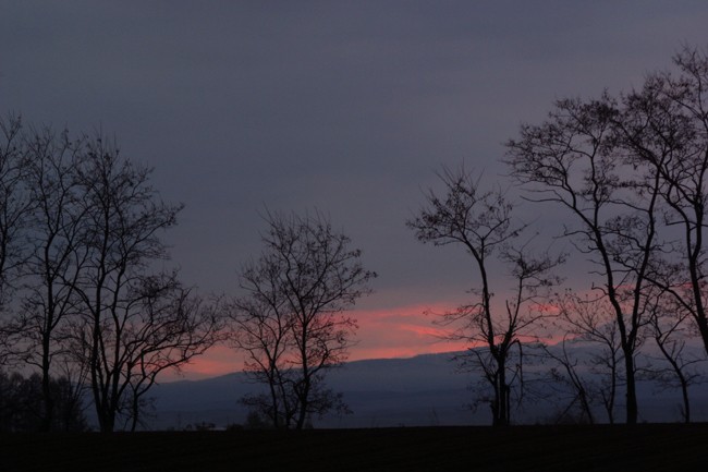 前日夕方、前線通過中で厚い雲に覆われた旭川に舞い降りた私は、「撮影」を諦めて、軽くロケハンをしながら宿(ペンションジャガタラ)に直行、早めの就寝。この季節の朝は早い。3時起床。3時半にはこの場所に到着した。暇なので某掲示板に書き込みなどしながら待つこと40分。4時を少し回った頃、暑い雲の間から今日の太陽が顔を出した。 右に少し写っている雪山は旭岳。 |