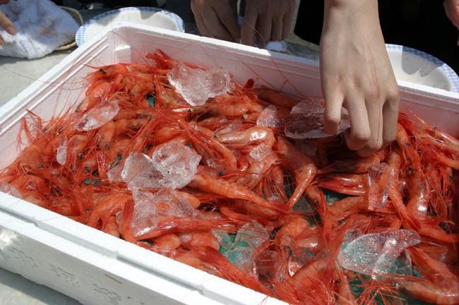 町の皆さんから獲れたてのエビの振る舞い。う、うまい!!