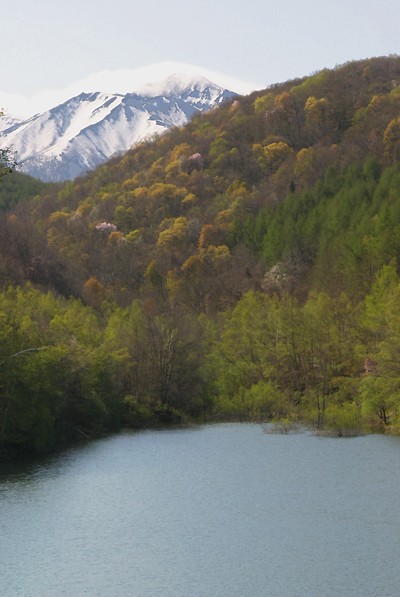 「ここの春紅葉は見事だよ!」と、前日知り合った同好の士からの情報は間違いなかった! 水を蓄えた春のダム湖、ちょこっと顔出した富良野岳‥、木々の窓を見つけ、望遠で。