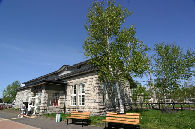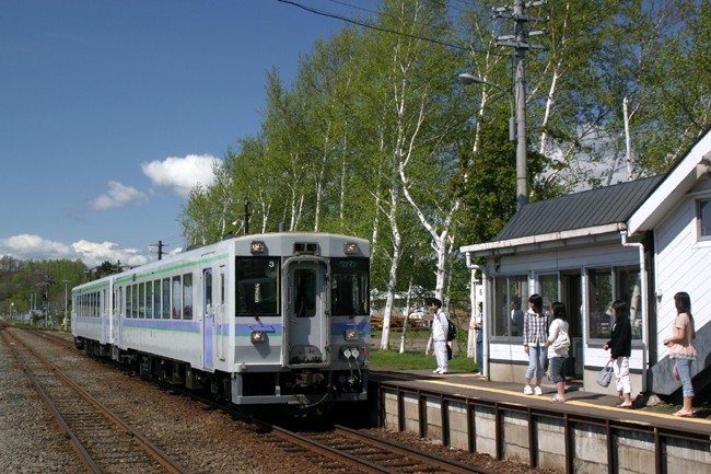 コーヒー飲みたいと美瑛の町に戻るが、まだ店はやっていない。美瑛の駅は新しい瀟洒な駅舎と、ホームには白樺並木。近代的であるがセンスがいい。今回初めて「広角」使用。