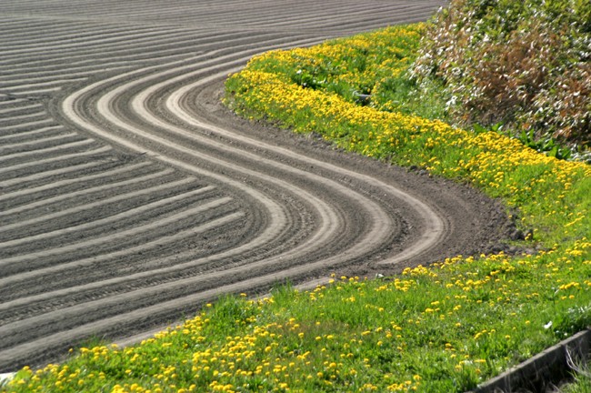 仕込みが終わったばかりの畑、畦道にはタンポポの群れ。これも春の丘風景