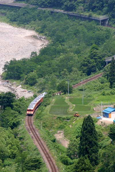やっと実現、ロープ俯瞰。下の国道とは眺めが違いますね。ヒメギフチョウが舞う楽園からご機嫌の数十分 やってきたのは「リバイバル白馬」。大糸で三両は長大である。