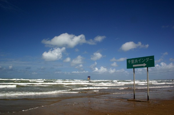 翌日は台風一過の快晴だったが、普段は砂浜走行ができる渚ハイウェイは波間の中 <石川県>