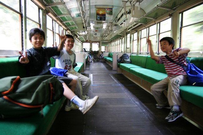 【明るい車内@】玉造で乗車してきた小学生。車内撮影しているだけで、このノリ具合!