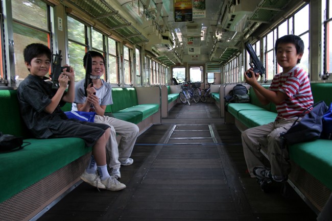 【明るい車内A】 「これも撮って!」と各自デイバッグからモデルガンを取り出す