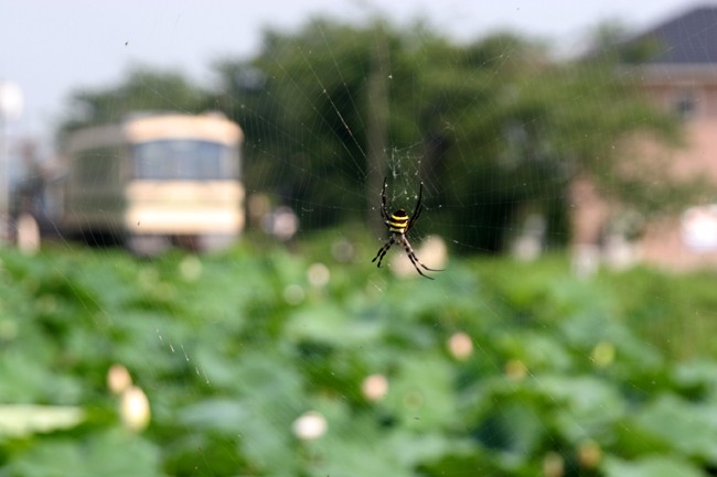 最後に蓮田を撮ろうと思ったが、大きな蜘蛛が気になり、これにピントを合わせた不気味な1枚 (常陸小川・四箇村間)