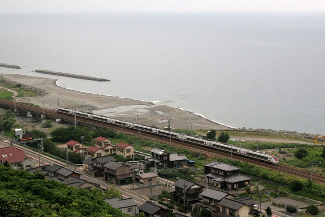 本日の締めは、市振の俯瞰場所。小さな川が富山県との県境。藪深い坂を汗だくになって登ったものの、天候を考慮するとレンタカー返却に間に合わないと判断し、お目当てだった「ボンネットはくたか」を撮らずに退散。非常にいい場所だっただけに天候ともども非常に残念。再訪を誓う。( 北陸本線 越中宮崎・市振間。Canon Kiss D、Canon50mm、ISO200、1/60秒、F9.0)