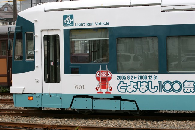 「TOYOTETSU」のロゴ入り。美濃町線を走っていた頃と同じカラーリングを保ちつつ、8月2日から豊橋の町を走る