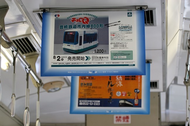市電車内では、800形(モ800)デビューを記念するちょろQの広告が。スター扱いですね!