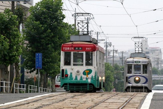 石畳の線路を、名古屋市電同士が行き交う。まるで数十年前に戻ったようです