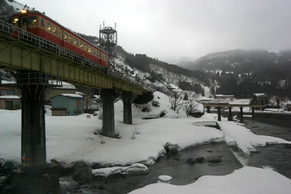 降り止まぬ雨、雪は緩み、気合が入らぬまま、宿と駅とを結ぶ橋の上から適当に構えた。