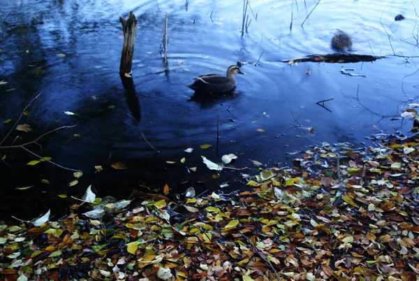 池の端には落ち葉が溜まり、冬近し‥