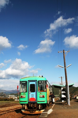 本巣駅。早朝は雲が多かったが、徐々に晩秋の青空が