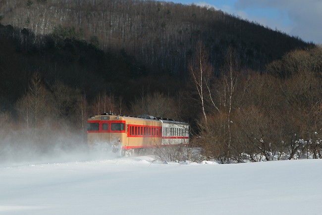 後追いで、もう1枚。雪雲が早く流れる空模様。列車通過時には日が当たってくれて、よかったです。