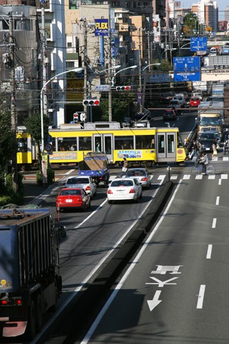 幹線道路を横切る路面電車。極めて昭和的なシーンである。